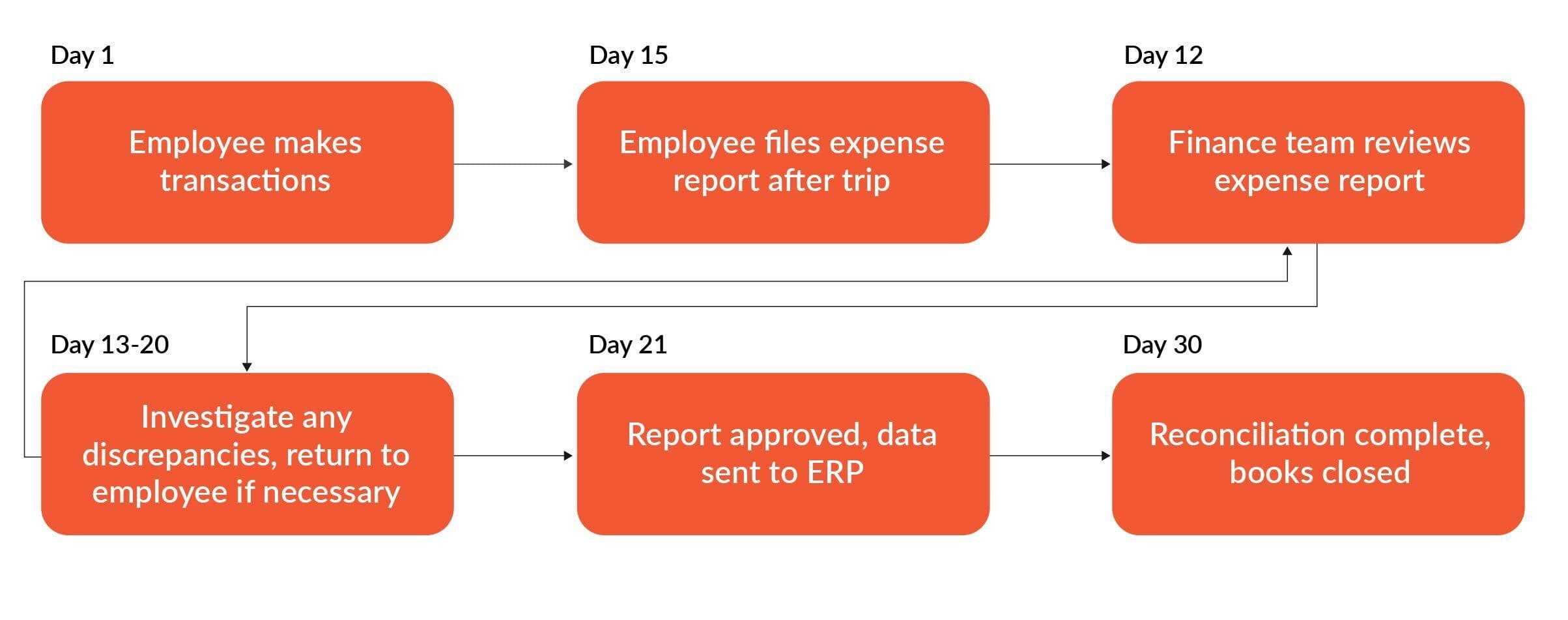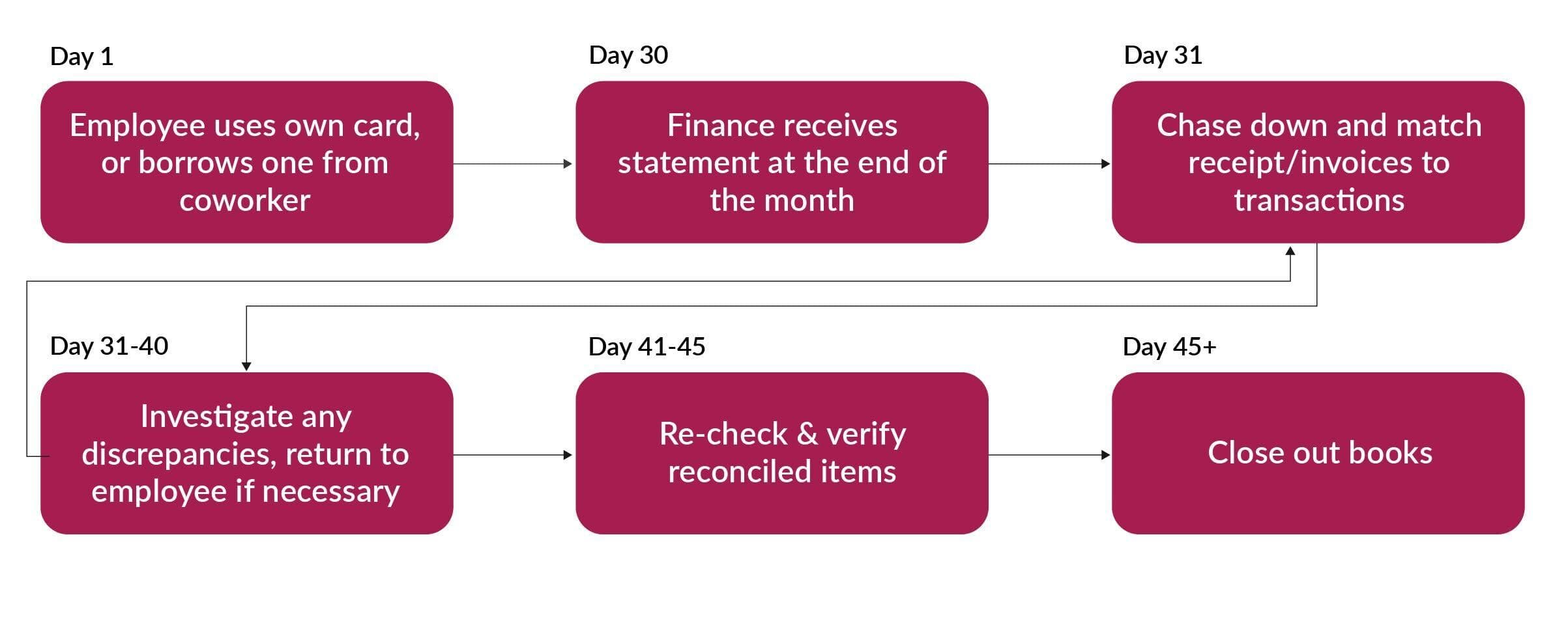 In the manual method, an employee uses their p-card to pay for vendor expenses. At the end of the month-long billing cycle, finance begins the arduous process of reconciling the transaction. They have to investigate discrepancies, match receipts and invoices against the transaction, and verify balances. In the best-case scenario, finance teams are able to reconcile the transaction a staggering 45 days after it occurred.