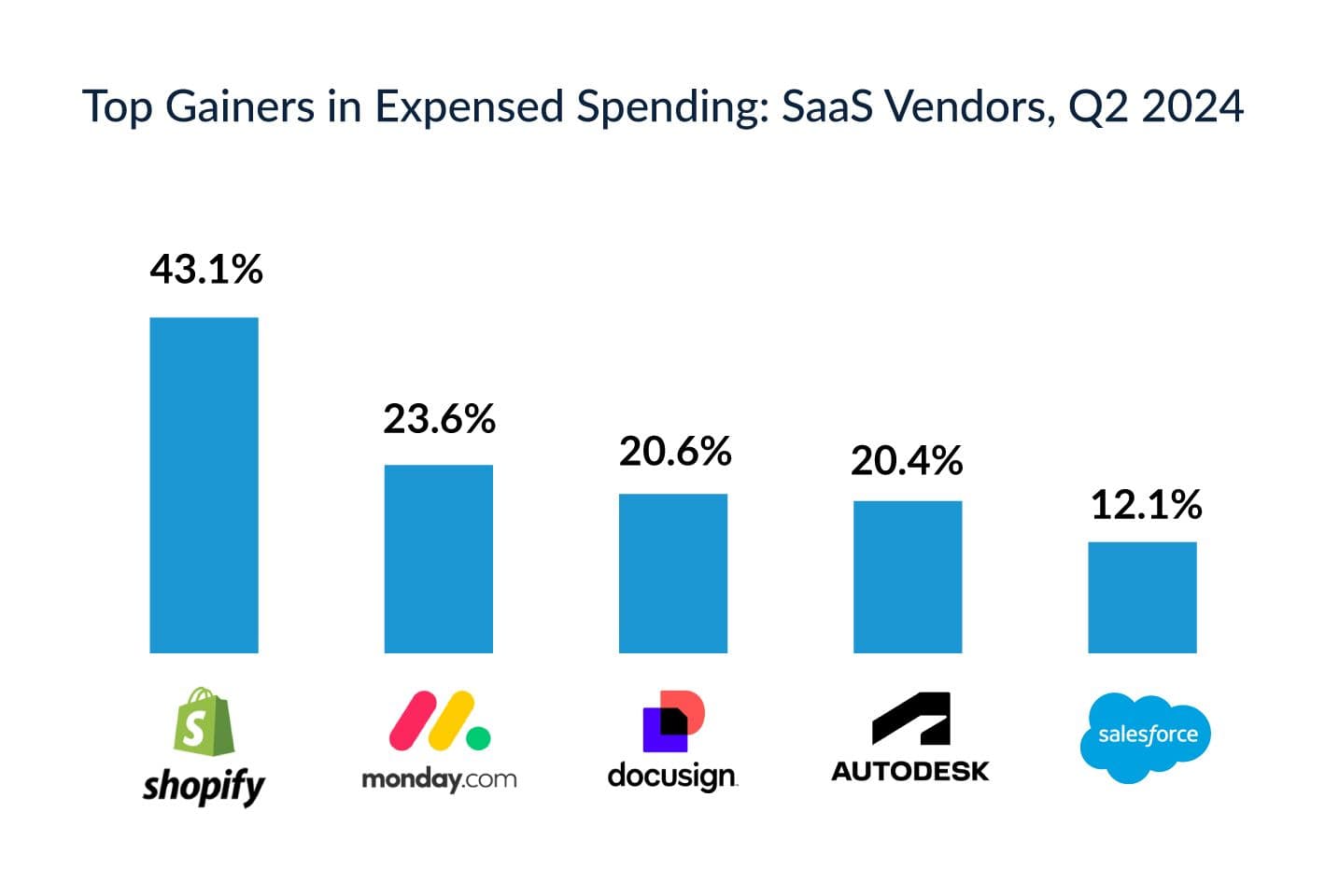 Despite broader economic concerns, spending on SaaS tools increased by 7.7% in Q2 2024 compared to the previous year. This rise demonstrates the essential role these tools play in supporting everyday business functions, from collaboration to project management. In fact, several high-profile vendors experienced substantial year-over-year growth in employee expense claims: Shopify led with a remarkable 43.1% increase, followed by Monday.com (23.6%) and DocuSign (20.6%).