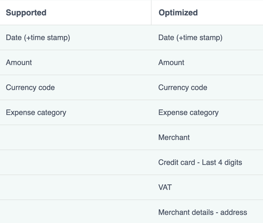 Receipt parsing capabilities are divided into optimized and supported countries, based on the number of fields our receipt parsing system can support. Fields essential to fill up an expense report and to automatically merge credit card and receipt transactions (amount, date, currency and expense category) are categorized as supported groups.