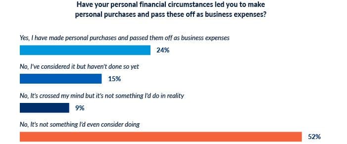 Corporate expense policies are compounding employees’ personal financial stress with undue pressure. As a result of their financial circumstances, 24% of employees admit to passing off personal purchases as business expenses. Another 15% have considered falsifying their expense reports but haven’t done so yet.