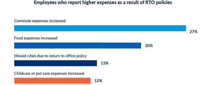 Unfortunately, returning to the office has placed additional strain on employees’ wallets. 27% of employees report experiencing higher commute expenses; 20%, food expenses; 12%, childcare or pet care expenses; and 13% have had to move cities to comply with their company’s RTO mandates.
