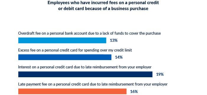 40% of employees reported incurring overdraft, excess, late payment fees or interest on a personal credit or debit card because of a business purchase. Additionally, 40% have been financially affected by their employer’s reimbursement times, either having to keep a closer eye on their finances or delay payments because they’re waiting for reimbursement.