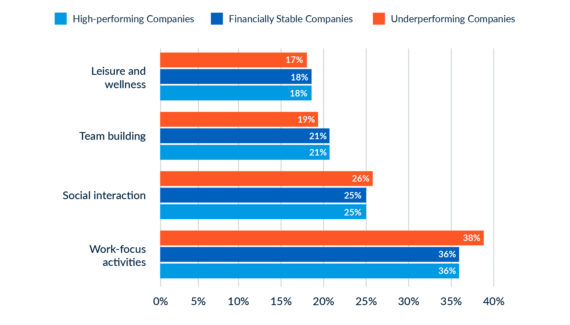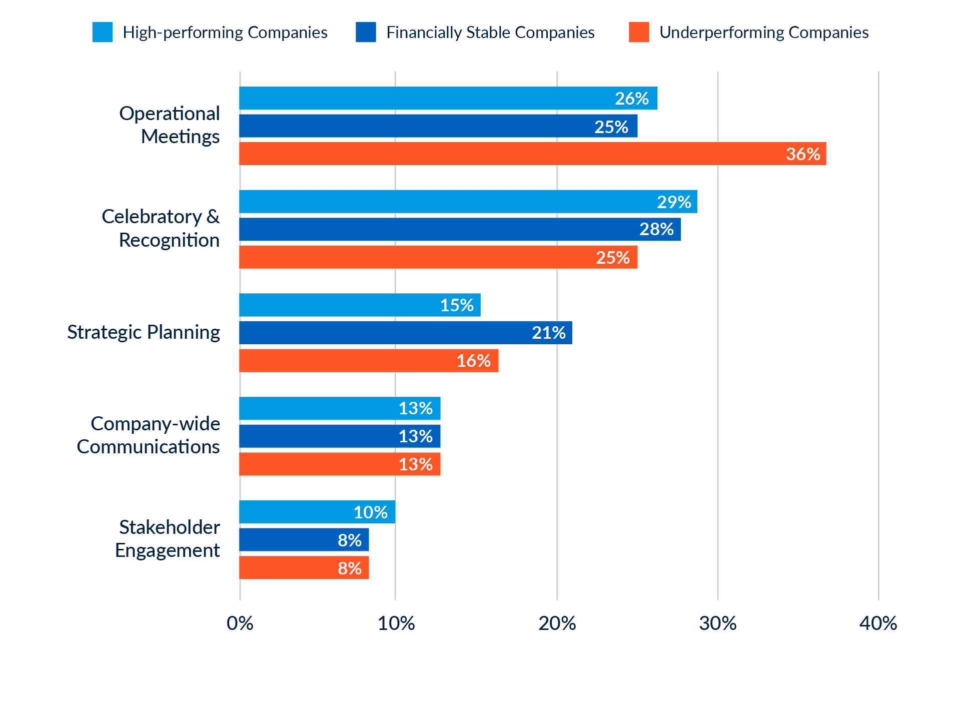 Underperforming companies show a stronger emphasis on operational meetings (leadership, project, and departmental meetings), totaling 36% of the time. Meanwhile, high-performing companies have a more balanced approach that incorporates celebratory events (29%), strategic planning (15%), and operational meetings (26%).