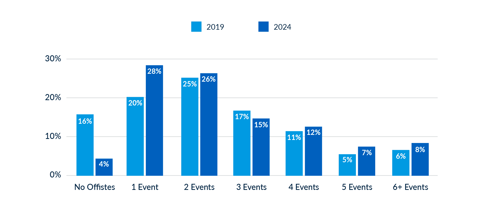 Corporate offsites have shown steady growth since 2019, with average annual gatherings increasing from 2.4 to 2.6 events in 2024. The number of companies holding no offsites has dropped from 16% to 4%, marking a clear shift toward these events becoming more commonplace.