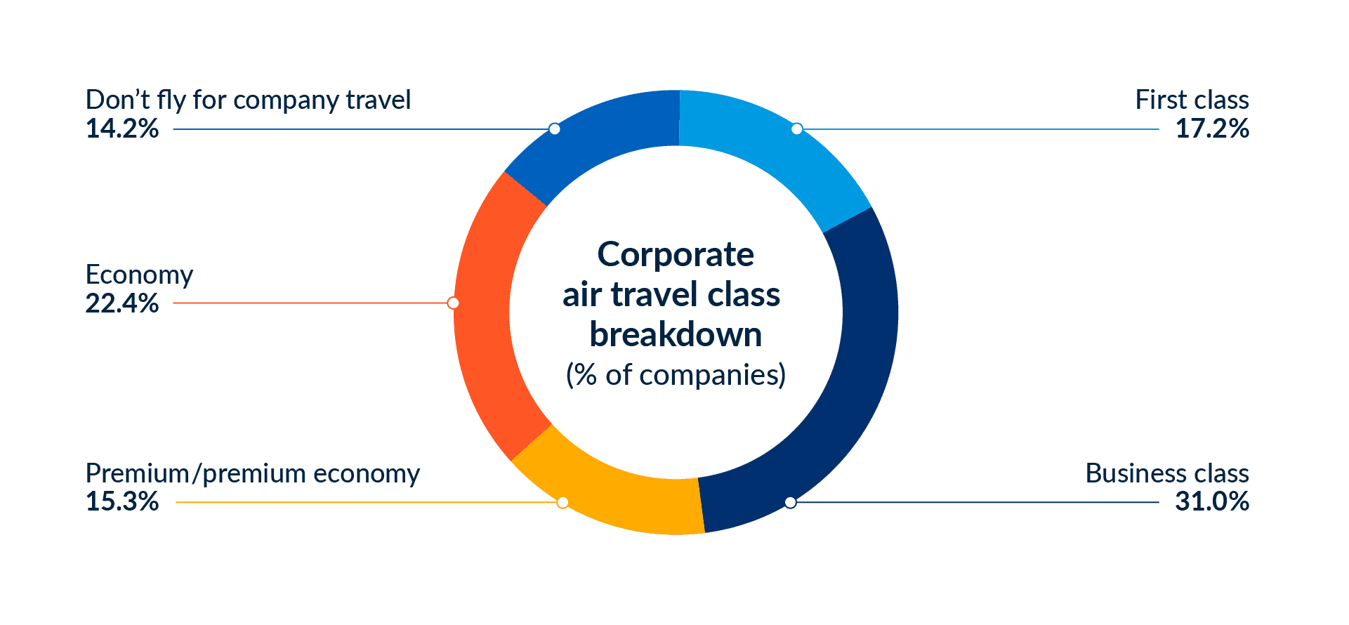 Nearly half (48%) of corporate travelers now fly business class or above—31% in business and 17% in first class. Only 22% still fly economy, demonstrating a noticeable shift in how companies are prioritizing employee travel comfort.