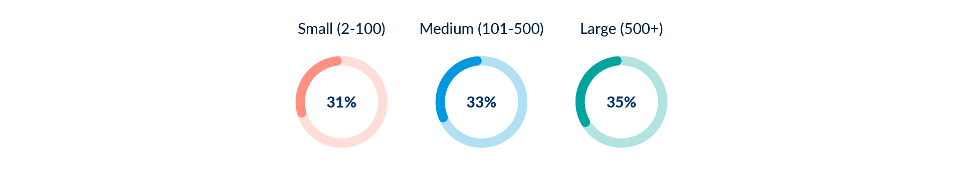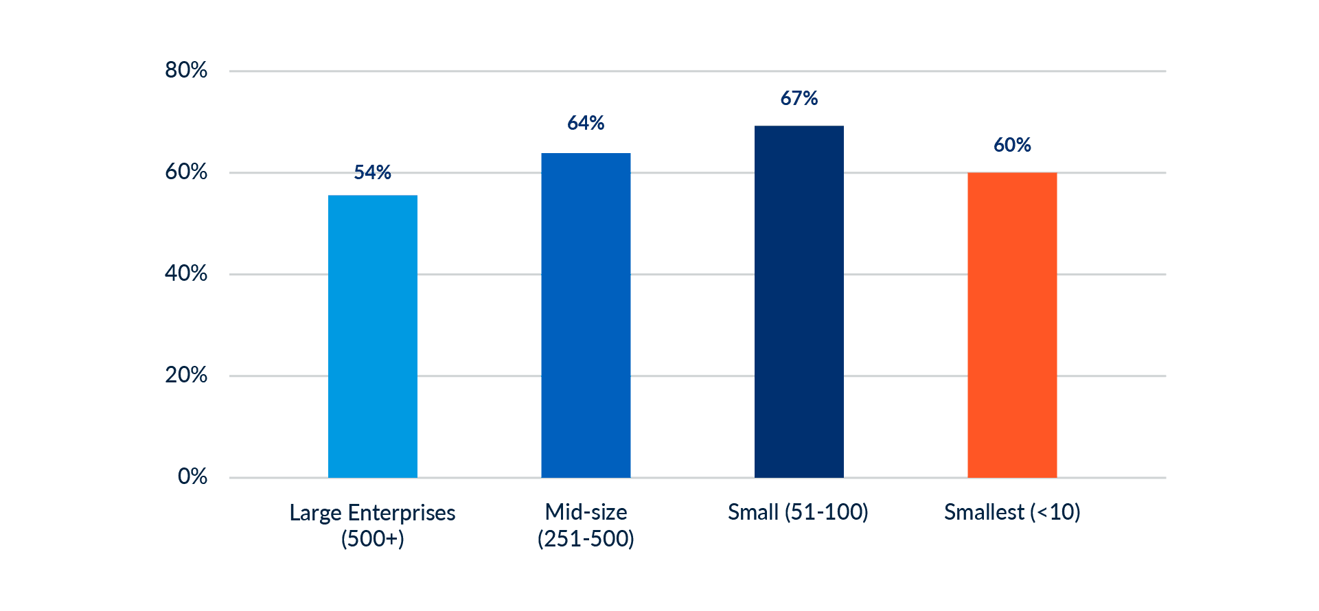 Small and mid-sized companies are driving the strongest investment growth, with 67% of companies with 51-100 employees reporting increased budgets compared to 2019. Mid-sized organizations (251-500 employees) follow closely at 64%, while large enterprises show more measured but still significant growth at 54%. This suggests that mid-market companies are particularly focused on leveraging offsites for team building and organizational development.