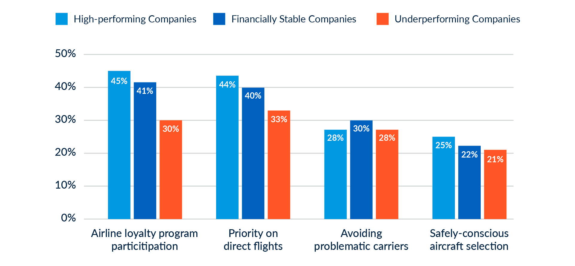 Safety concerns show more uniformity across organizations. All company types show similar preferences when it comes to avoiding airlines where their employees have encountered issues in the past (28%-30%) and for aircraft safety (21%-25%), suggesting these are industry-standard considerations rather than differentiating factors. While basic safety considerations are universal, high-performing companies distinguish themselves by investing in the employee experience and efficiency.