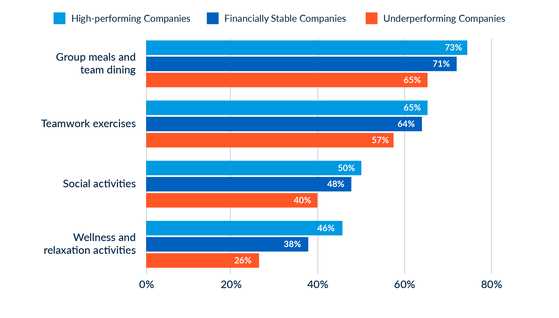 From team dining (73%) to wellness activities (46%), high-performing companies maintain stronger participation rates compared to their underperforming counterparts, who show much lower engagement, particularly in wellness (26%) and social activities (40%).