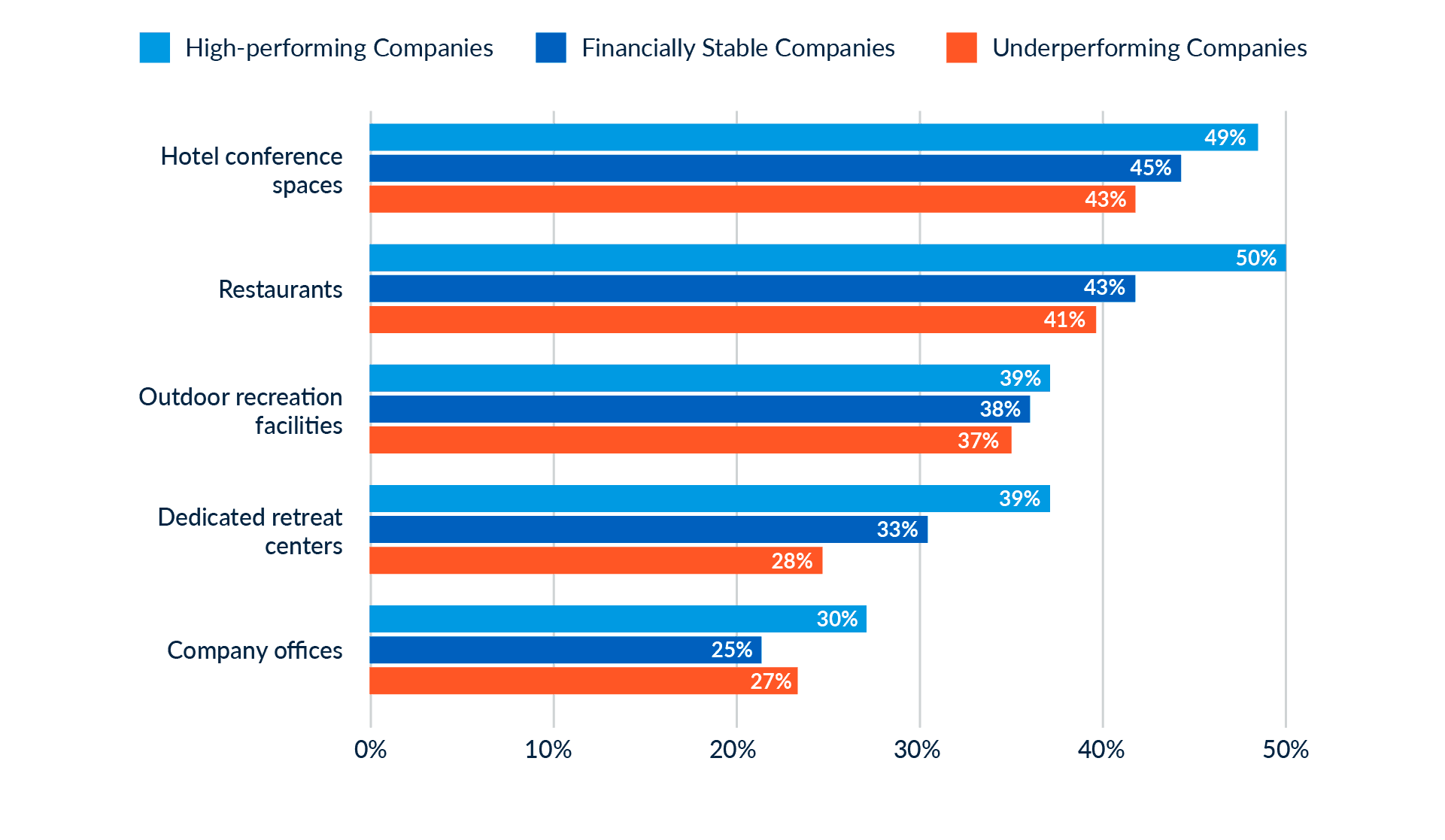 The data reveals a striking link between where companies hold offsites and how well employees connect with each other. Compared to underperforming companies, high-performing companies tend to favor venues that spark natural interaction—50% choose restaurants (vs. 41%) and 39% use retreat centers and outdoor recreation facilities (vs. 28% and 37%, respectively).