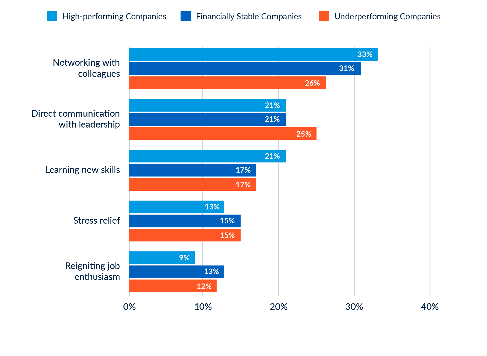 Employees at high-performing companies value networking and skills development, while those at underperforming companies show a stronger need for leadership interaction.