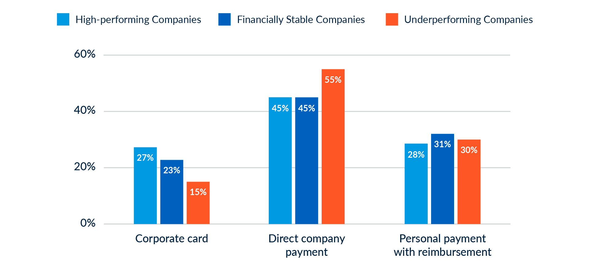 High-performing companies tend to trust employees with corporate cards more often (27%), while underperforming companies prefer to handle all payments directly (55%). This could suggest different approaches to travel and expense management—high performing companies seem more comfortable giving employees spending autonomy, while others want more control by paying for everything for employees upfront. Interestingly, the burden of paying out of pocket and getting reimbursed remains relatively consistent across all company types, affecting roughly 30% of employees.