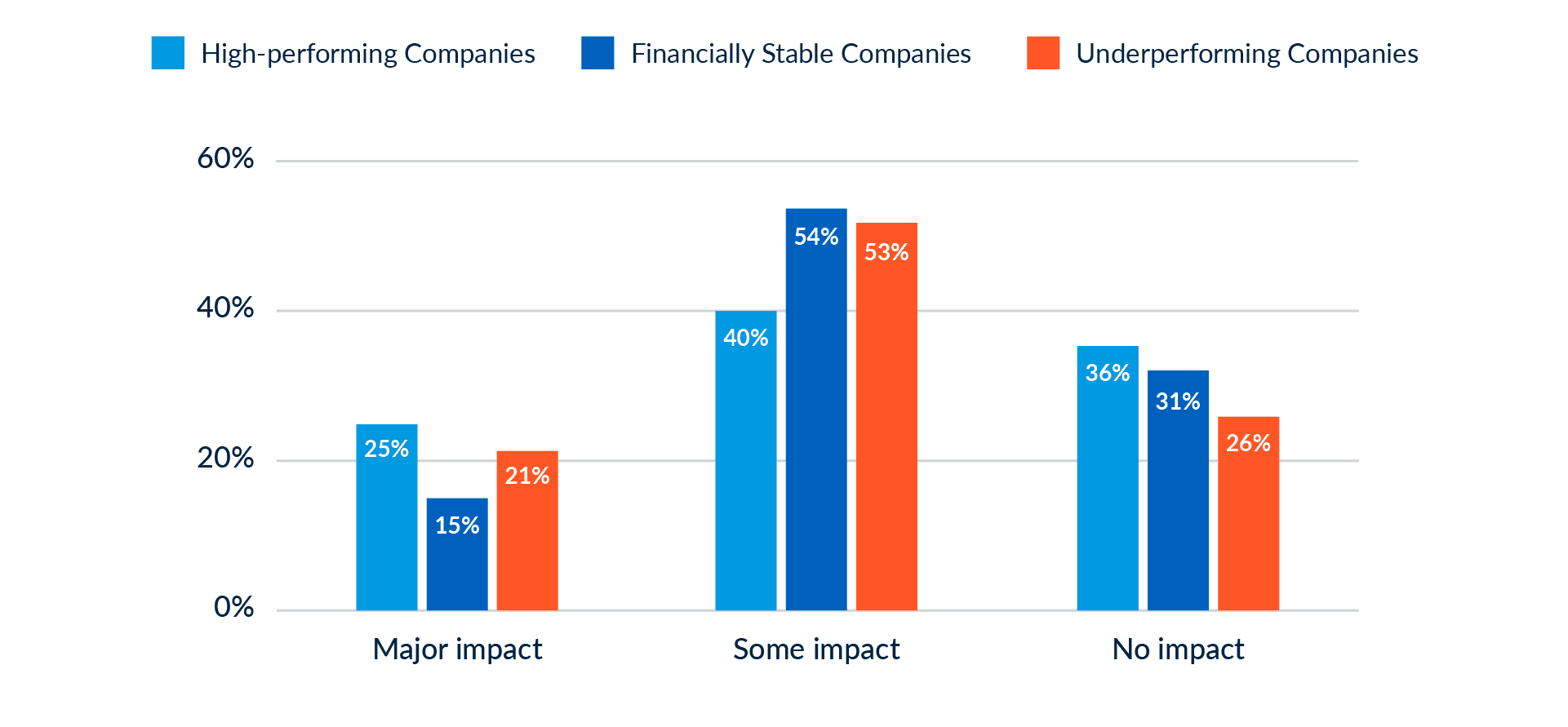 Despite leading in comprehensive coverage (with 36% of employees reporting no financial impact) 25% of employees in high-performing companies do face major financial strain when traveling for offsites. It's possible that more frequent travel or high-end events require additional personal expenses.