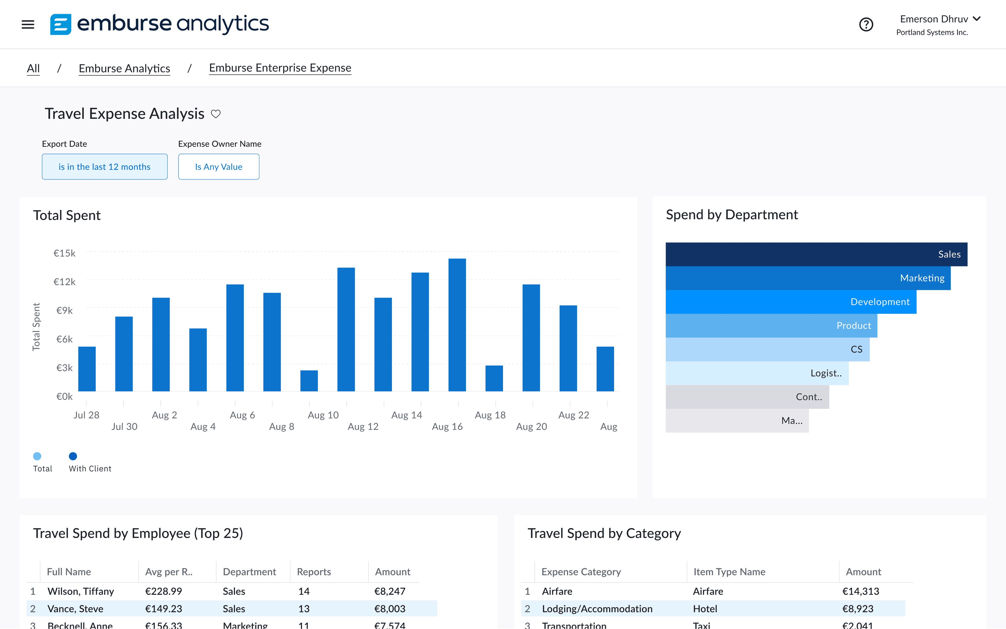 Le soluzioni Emburse utilizzano funzionalità analitiche evolute per fornirti informazioni aggiornate e precise, a differenza dei tradizionali software per la gestione di viaggi e note spese. Accedi a un’unica fonte di dati per prendere decisioni informate, eliminando la dispersione delle informazioni aziendali.